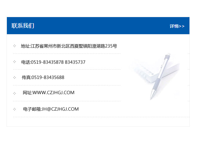 地址:常州市新北區友邦商務大廈1幢16、17層  電話:0519-85101652  傳真:0519-85112595  郵編:213022  網址:www_cz-jiayue_cn.szyuxinyuan.com  郵箱:xiajifengaa@163.com